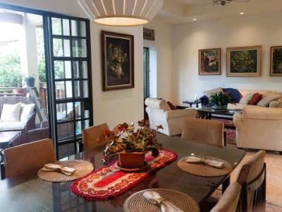 ID# 117167. Modern house for sale in Santa Ana. Valle del Sol Condominium. 4 bedrooms, 4 bathrooms, 720 m2 of construction, 980 m2 of land US$1,150,000. Located in the exclusive Valle del Sol residential area in Santa Ana, this impressive modern house stands out for its contemporary design, generous lighting, and open spaces that create a cozy and sophisticated atmosphere. With panoramic views of the golf course, this residence is an oasis of luxury and tranquility, offering an unparalleled living experience. The house, with a construction of 720 m2 on a spacious lot of 980 m2, is designed to maximize the comfort and lifestyle of its residents. Upon entering the property, you are greeted by a spacious living-dining area that seamlessly integrates with the kitchen and terraces, creating a continuous flow between indoor and outdoor spaces. This open area is ideal for entertaining and family living, allowing you to enjoy the views and natural light at all times. On the first level, in addition to the social areas, there are two complete bedrooms, each with its own bathroom. These bedrooms are designed to offer privacy and comfort, perfect for guests or family members who prefer to be on the ground floor. Moving up to the second level, you find the master bedroom, a suite that provides a private retreat with all amenities. This bedroom has a spacious bathroom and a walk-in closet, as well as spectacular views of the golf course. Next to the master suite, there is a television area, ideal for moments of relaxation and entertainment. The third level of the house adds an additional touch of exclusivity and functionality. Here you will find another bedroom along with a private office, making this space perfect for working from home without interruptions. This configuration is ideal for professionals who need a quiet and productive environment without sacrificing the comfort of living in a spacious and well-designed house. In addition to its four spacious bedrooms, the house offers four full bathrooms, strategically distributed for the comfort of all inhabitants. With capacity for six vehicles, the parking spaces are designed to accommodate both family and guests. Valle del Sol is one of the most sought-after residential areas in Santa Ana, known for its security, tranquility, and proximity to all the amenities this thriving area offers. Living here means being just minutes away from the best schools, shopping centers, restaurants, and services in the region. Additionally, access to main routes facilitates connection with other important areas of San José. The high-quality finishes and attention to detail are evident in every corner of this residence. From the marble floors to the modern appliances in the kitchen, every element has been carefully selected to ensure an exceptional level of living. This house in Valle del Sol is not just a place to live but a statement of style and comfort. Its modern design, along with the views of the golf course and the integration of spaces, create a unique environment that combines luxury and functionality. Whether to enjoy a full family life or to entertain friends and loved ones, this property offers everything you could desire and more. Santa Ana, with its pleasant climate and picturesque surroundings, is the perfect place for those seeking a tranquil yet connected life. The location of this house within such a prestigious residential area adds an additional layer of exclusivity and security, making this property an ideal choice for those who value good living. In summary, this modern house in Valle del Sol is an architectural gem that offers a perfect combination of luxury, comfort, and prime location. It is a unique opportunity for those seeking exclusivity in Santa Ana.