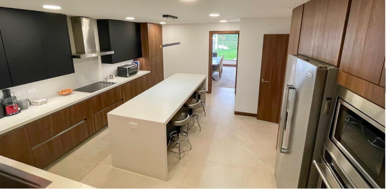 ID# 117302. House for sale in Escazú. 5 bedrooms, 4.5 bathrooms, 572 m² of construction, 766 m² of land, US $1,100,000. Located in the prestigious neighborhood of Los Laureles, this stunning residence redefines elegance and comfort in one of the city's most exclusive areas. Its privileged location provides quick access to top-tier services, shopping, and entertainment, ensuring an unparalleled quality of life. This property seamlessly combines spaciousness and avant-garde design, boasting 580 m² of construction on a generous 760 m² lot. Recently renovated, it features a contemporary aesthetic with clean lines, a neutral color palette, and high-end finishes throughout. Upon entry, an elegant water feature sets the tone for the sophistication that defines this home. The main level offers a warm and functional ambiance, including a designer living room and a state-of-the-art, fully equipped kitchen. A covered terrace blends seamlessly with a lush garden, creating a private oasis in the heart of the city. Additionally, the property includes a spacious laundry and storage area for added convenience. The upper level boasts three sumptuous bedrooms with en-suite bathrooms, complemented by a family room and an ideal office space, perfectly suited for modern living and remote work. The rooftop is a true retreat, designed for both entertainment and relaxation, featuring luxurious furnishings and a portable fire pit that enhances the ambiance for warm and exclusive evenings. As an added value, the property includes an independent two-bedroom, 1.5-bathroom apartment, ideal for hosting guests or generating rental income. The garage accommodates three vehicles, with additional parking available for the apartment and visitors. With meticulous design, impeccable finishes, and a garden featuring a jacuzzi for ultimate enjoyment, this residence represents an exceptional opportunity in Los Laureles.
