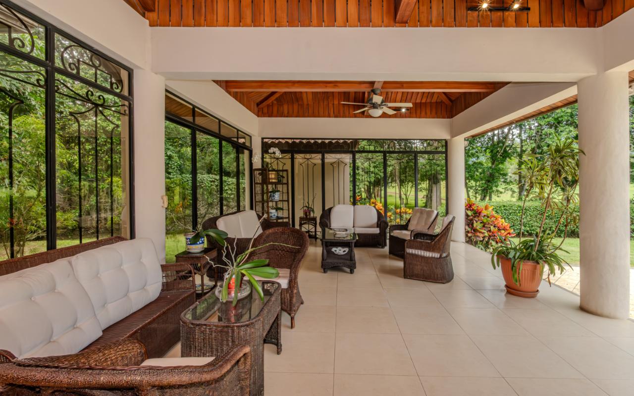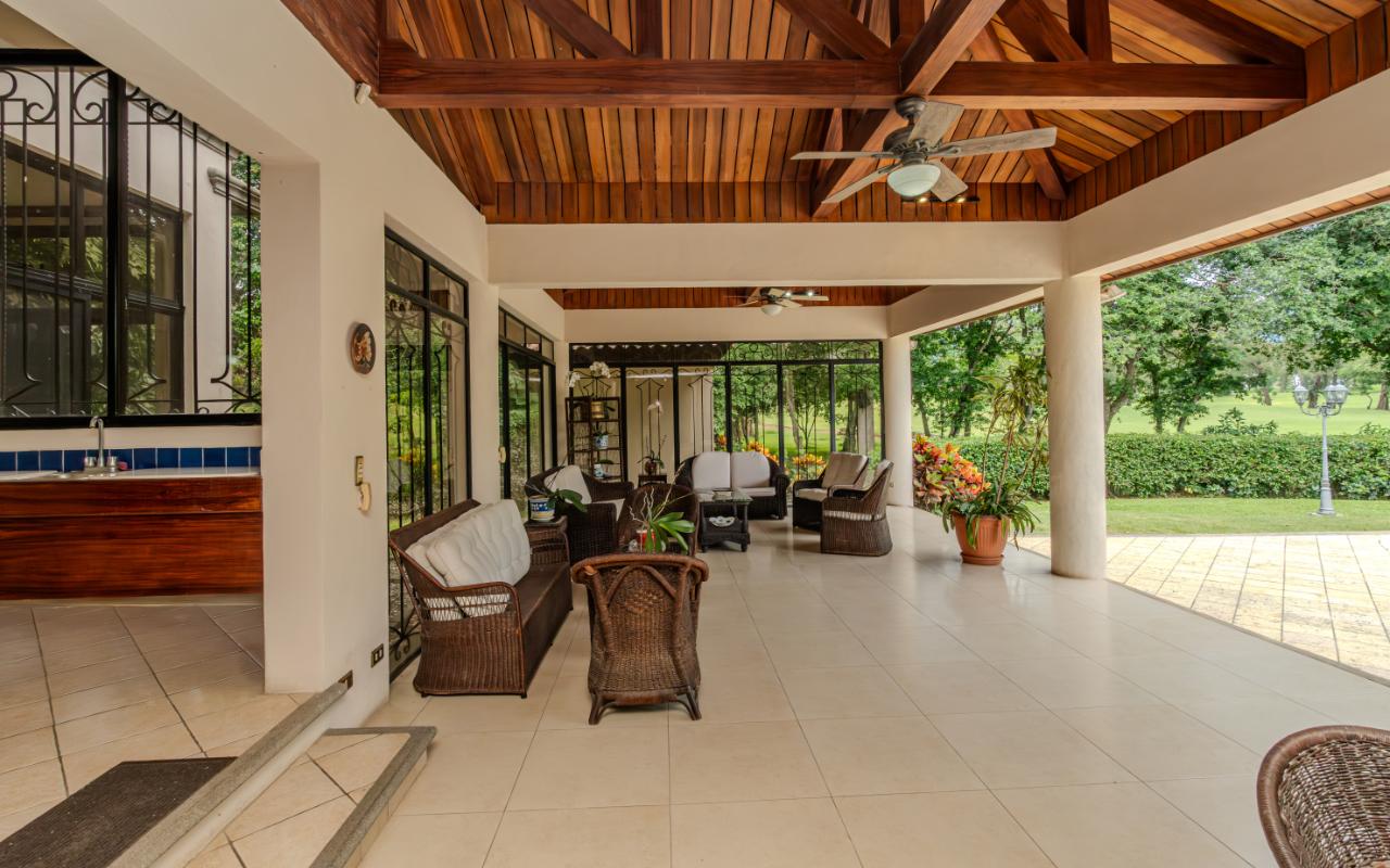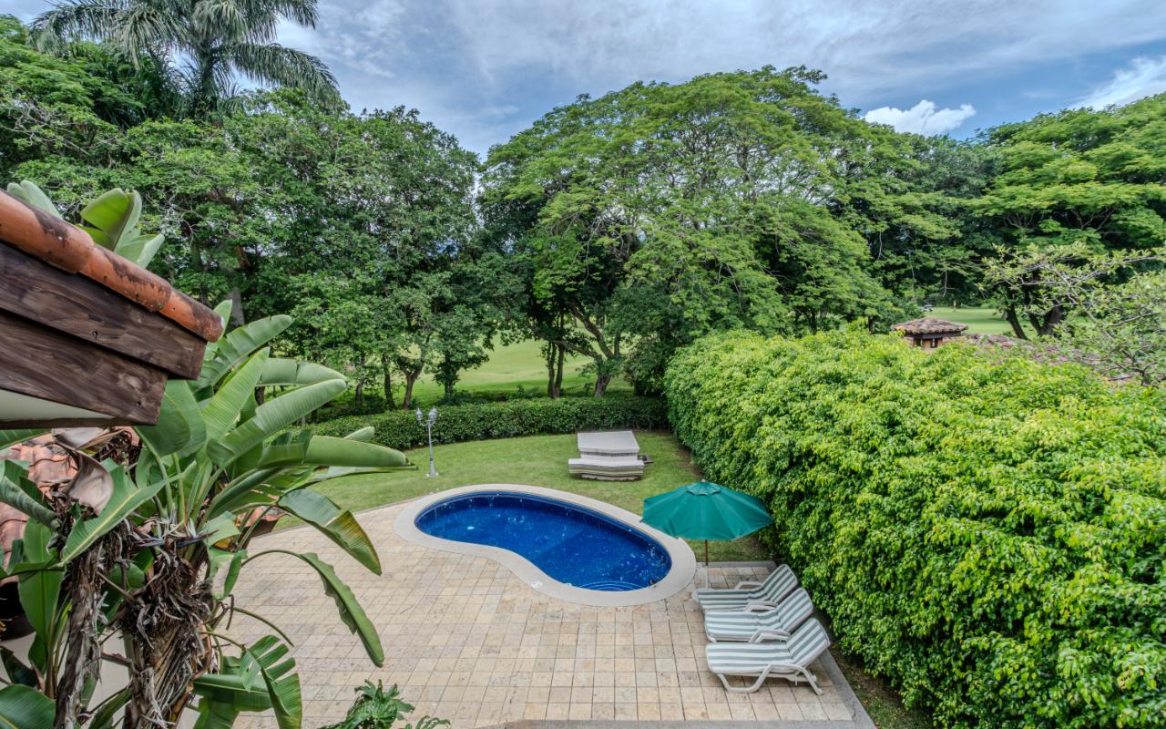 One of the most exceptional features of this home is the expansive covered terrace, designed for year-round enjoyment of Santa Ana’s ideal climate. With a coffered wooden ceiling, porcelain flooring, and charming ironwork details, this space offers a perfect setting for entertaining while overlooking the landscaped gardens and the golf course. Next to the terrace, a full bathroom provides additional convenience. Outdoors, the private pool creates an oasis of relaxation surrounded by nature, while a discreet utility area ensures optimal functionality.