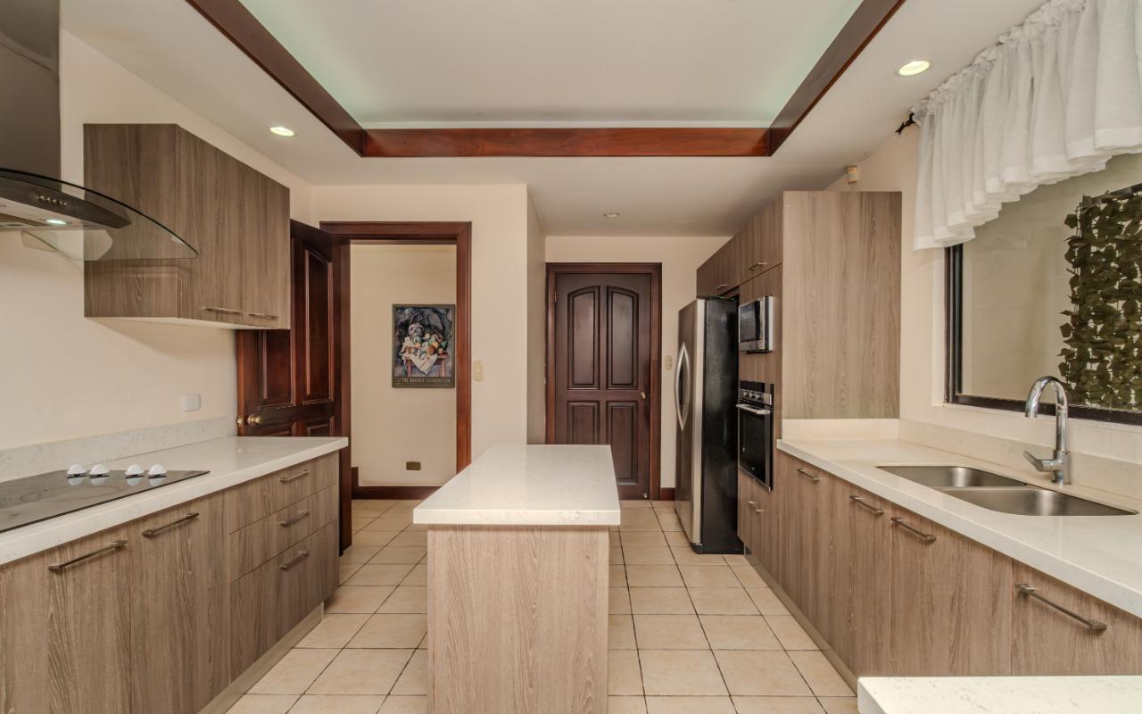 The main level includes two spacious bedrooms, each with a full bathroom, walk-in closet, and air conditioning, offering comfort and privacy for family members or guests. A multifunctional room between the bedrooms works perfectly as a TV room, office, or library, enhanced by custom woodwork that adds warmth and sophistication. The kitchen combines functionality and design, featuring high-quality cabinetry, a breakfast nook with natural ventilation, and direct access to the service area, which includes a storage room, covered drying area, and full service bedroom with closet.