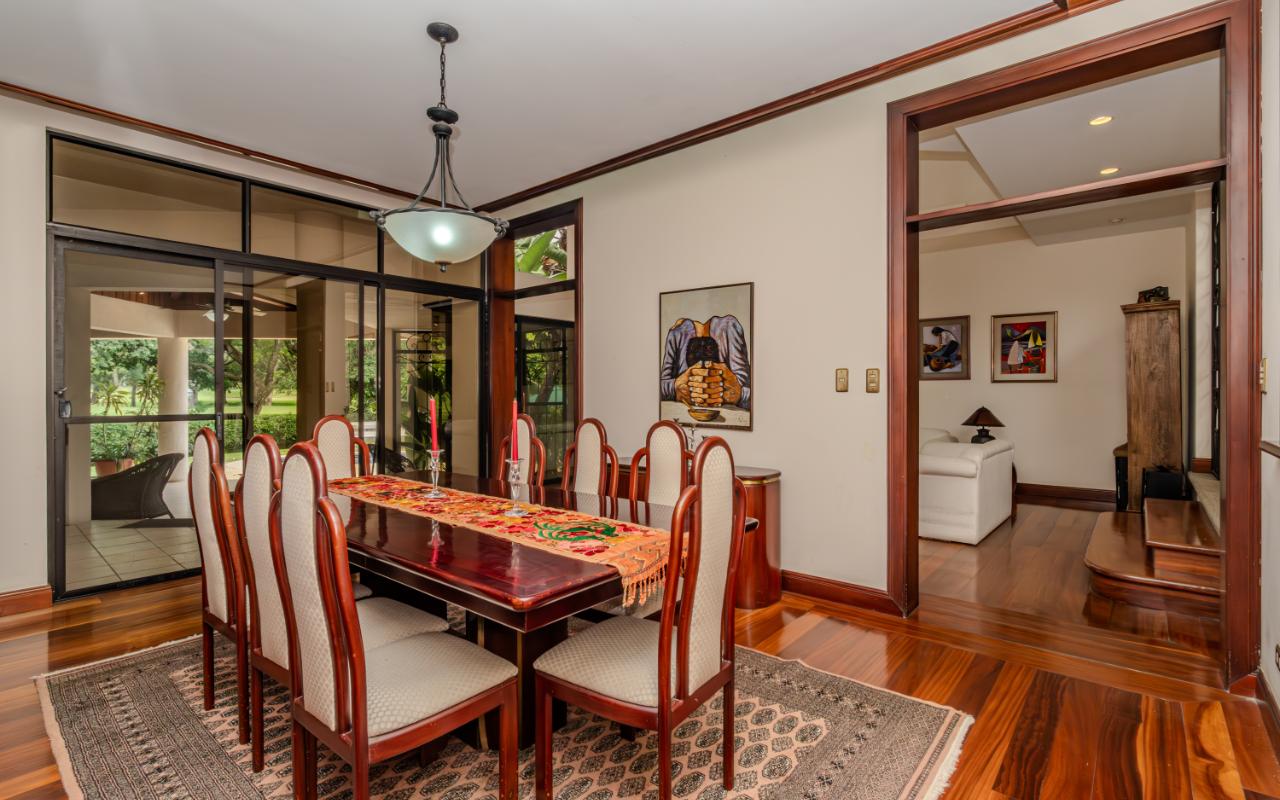 Upon entering, an impressive double-height foyer welcomes you with abundant natural light and a feeling of spaciousness that flows throughout the home. The main living room features wooden floors, soaring ceilings, and oversized windows framing serene views of the gardens, private pool, and golf course, creating a refined and tranquil atmosphere ideal for both social gatherings and daily enjoyment. Adjacent to the living room, the formal dining area provides an elegant and intimate environment, surrounded by floor-to-ceiling windows that connect directly to the terrace and outdoor social spaces.