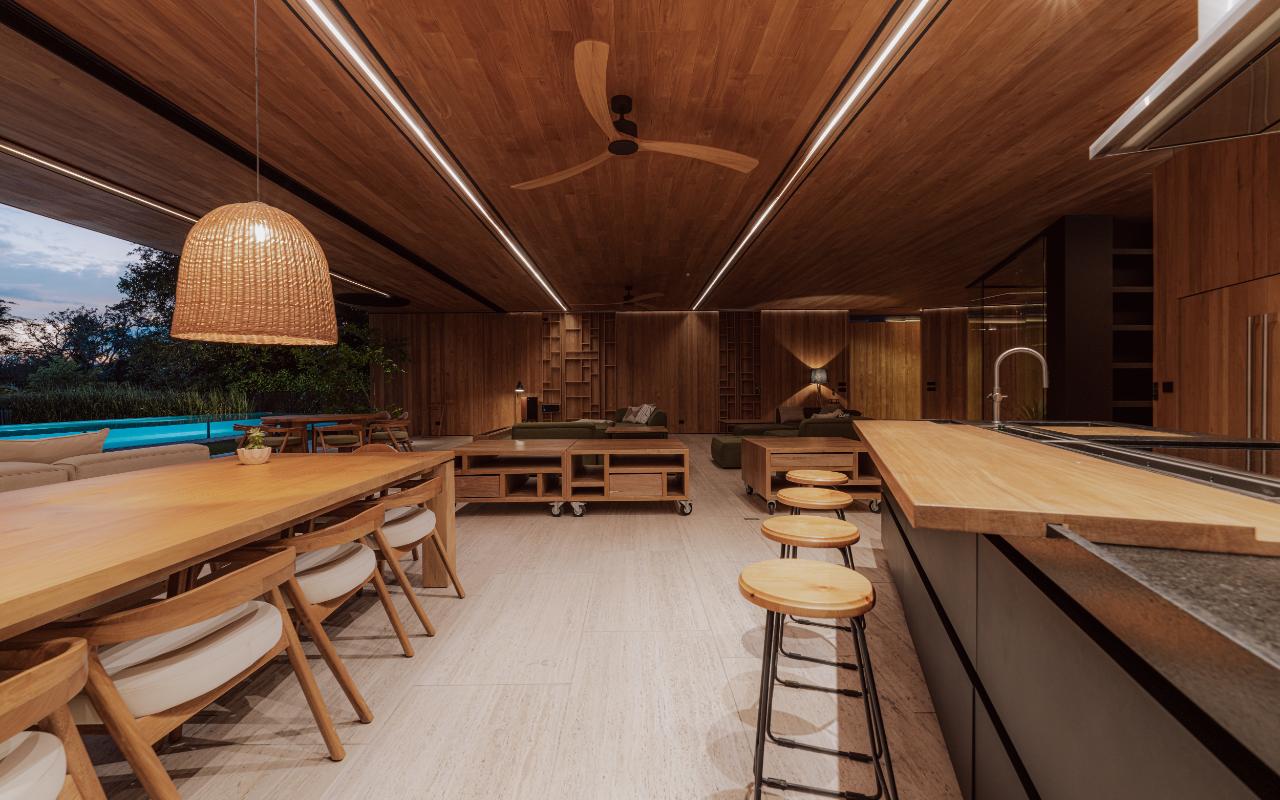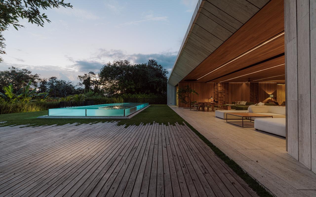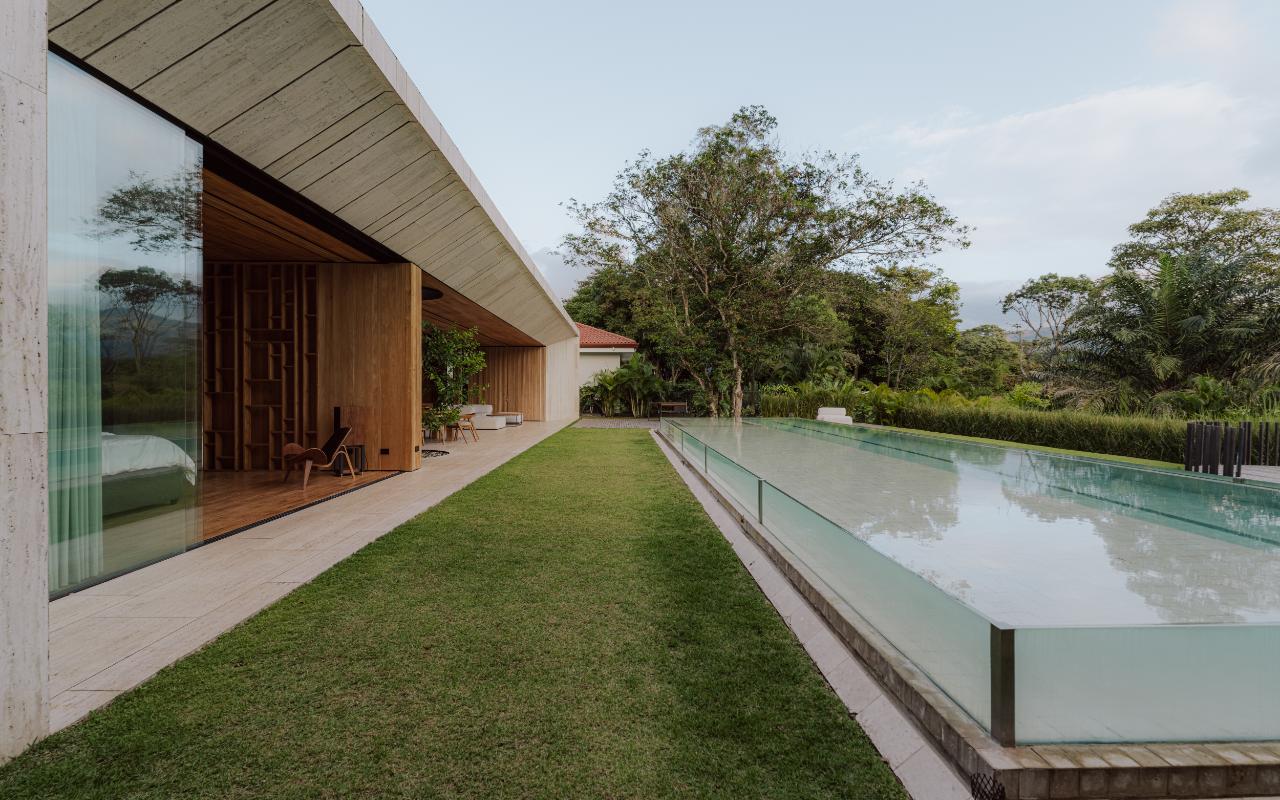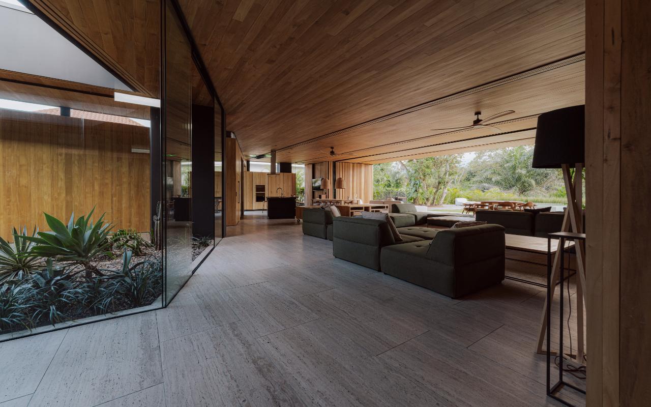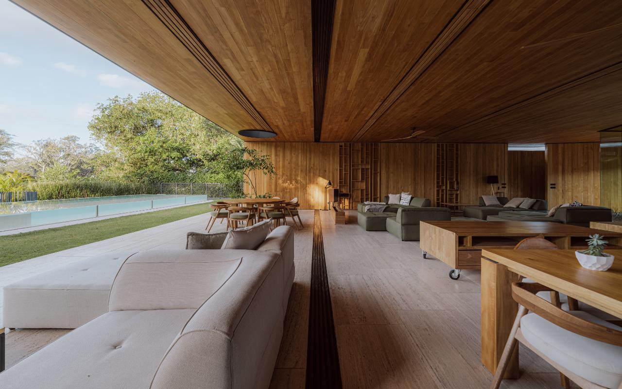 ID# 117469. Single-Level Architectural Masterpiece in Valle del Sol, Costa Rica. I 1,504 m² lot I 1,255 m² total construction. This is not a house. This is a statement. Set on a 1,504 m² lot with 1,255 m² of total construction, Casa Brutale stands among the most architecturally significant residences ever offered for sale in Valle del Sol, Santa Ana—the premier golf community on the west side of San José. Conceived on one single level with zero steps (only a teak sky deck above), the home captures elevated, uninterrupted views over the protected golf course green area and lake, delivering rare privacy, visual scale, and a constant connection with nature that defines Costa Rica real estate at its finest. The architectural language pays homage to Ludwig Mies van der Rohe and the iconic Barcelona Pavilion. Exterior façades and interior floors are wrapped in Italian travertine marble, while light wood walls and ceilings add warmth and acoustic elegance. Custom shelving subtly references the geometric compositions of Piet Mondrian. The result is a residence where architecture, art, and materials become the living experience. The layout features six en-suite bedrooms, three with walk-in closets, including a private guest wing with independent access, two suites, and its own TV lounge. The primary suite (approx. 105 m²) operates as a private spa, with soaking tub, dual showers, dual vanities, dual toilets, two walk-in closets, plus an outdoor jacuzzi and shower immersed in greenery. A dramatic interior courtyard anchors the home, flooding every space with natural light and enabling ideal cross-ventilation for Costa Rica’s climate. Above it, a cantilevered office floats with direct views to the golf course. The social core is defined by two designer kitchens with SMEG appliances and a one-of-a-kind custom island. A full staff apartment for two connects seamlessly to the secondary kitchen. Amenities continue with a large TV lounge featuring a retractable floor-rising TV, gym, sauna, wine cellar, storage rooms, toys room, and a signature BBQ social area. Outdoors, teak defines the lifestyle through a circular river/yoga deck, 100 m² and 20 m² garden decks, and a 360° panoramic sky deck. The centerpiece is a glass infinity pool overflowing on all four sides (15.7 × 4.7 m) with swim lane, integrated bathtub, and solar heating maintaining water temperatures between 28–31°C year-round. LED lighting throughout, solar hot water, and covered parking for 4–5 cars plus 3 motorcycles complete the property’s technical excellence. Located minutes from Route 27, Escazú, top private schools, leading clinics, fine dining, and just 30 minutes from Juan Santamaría International Airport (SJO), Casa Brutale is a true collector’s residence within the Valle del Sol golf community—crafted for buyers who understand architecture, scale, privacy, and the rarity of owning a landmark home in Santa Ana real estate.
