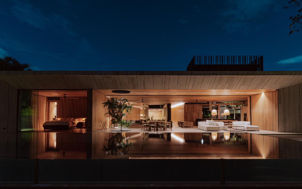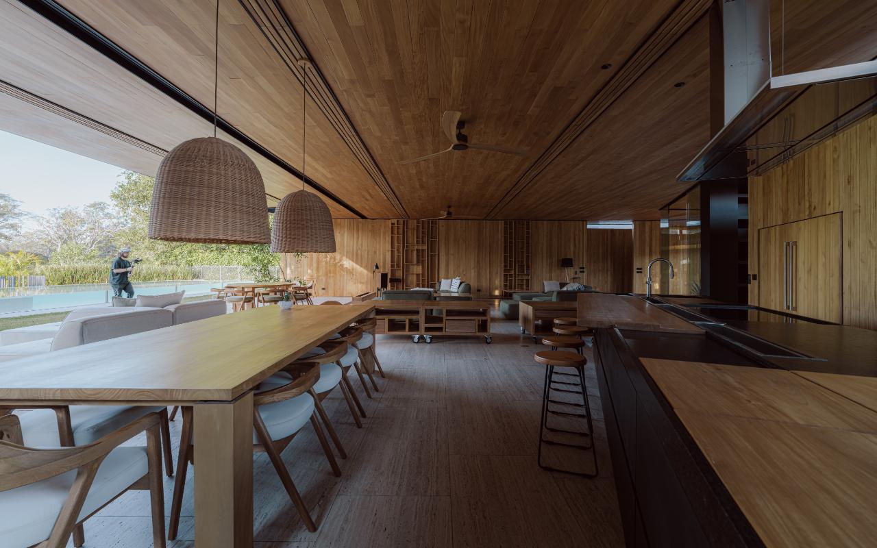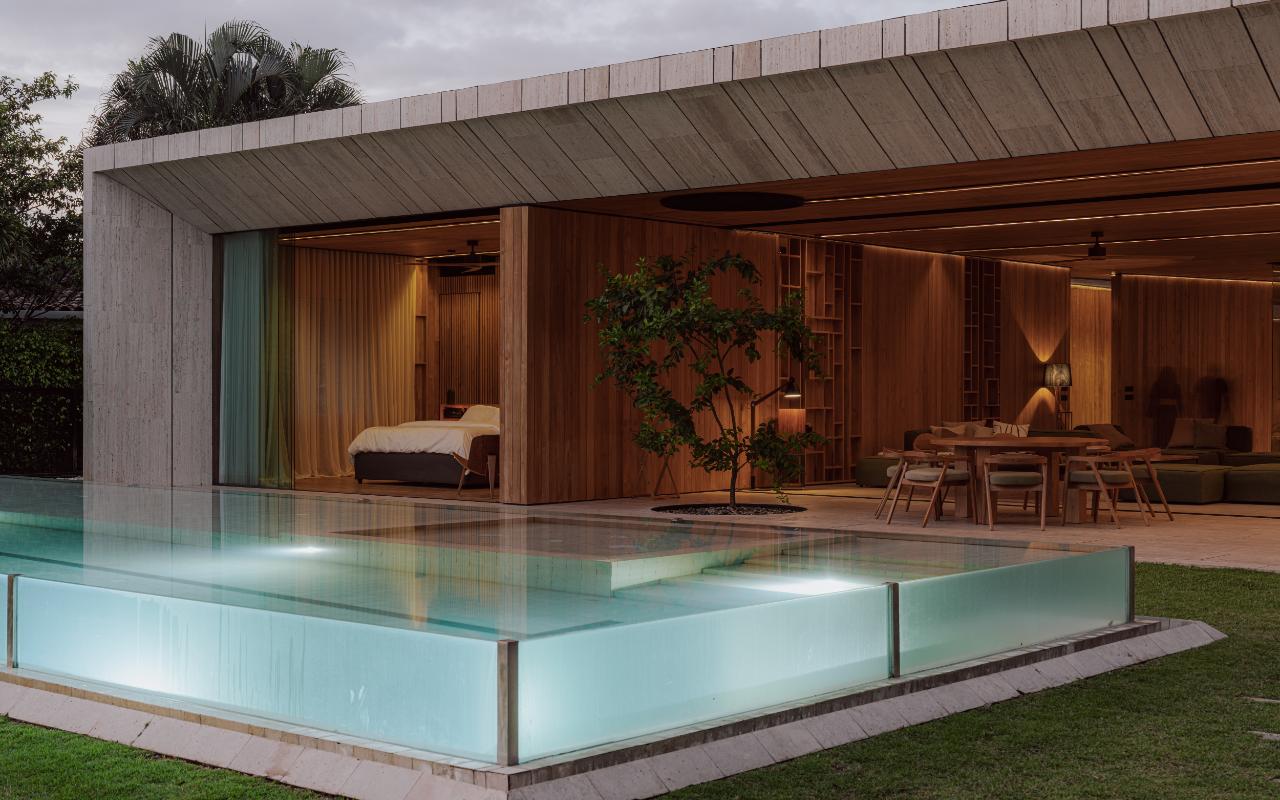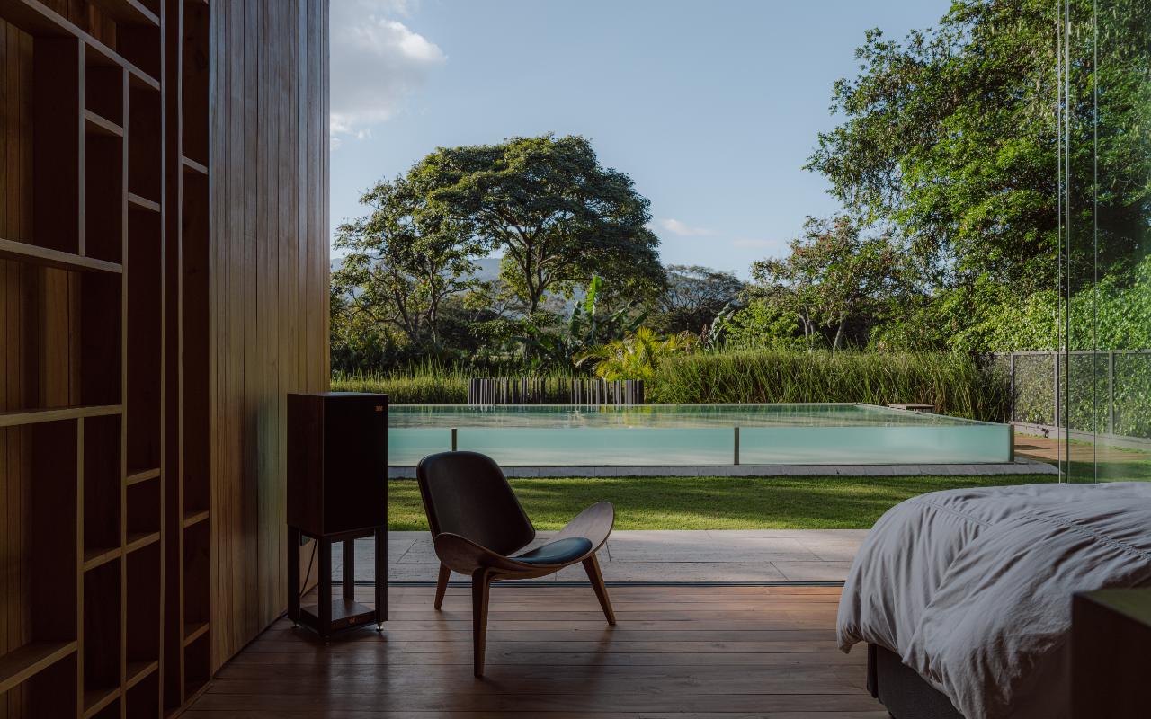 ID# 117469. Single-Level Architectural Masterpiece in Valle del Sol, Costa Rica. I 1,504 m² lot I 1,255 m² total construction. This is not a house. This is a statement. Set on a 1,504 m² lot with 1,255 m² of total construction, Casa Brutale stands among the most architecturally significant residences ever offered for sale in Valle del Sol, Santa Ana—the premier golf community on the west side of San José. Conceived on one single level with zero steps (only a teak sky deck above), the home captures elevated, uninterrupted views over the protected golf course green area and lake, delivering rare privacy, visual scale, and a constant connection with nature that defines Costa Rica real estate at its finest. The architectural language pays homage to Ludwig Mies van der Rohe and the iconic Barcelona Pavilion. Exterior façades and interior floors are wrapped in Italian travertine marble, while light wood walls and ceilings add warmth and acoustic elegance. Custom shelving subtly references the geometric compositions of Piet Mondrian. The result is a residence where architecture, art, and materials become the living experience. The layout features six en-suite bedrooms, three with walk-in closets, including a private guest wing with independent access, two suites, and its own TV lounge. The primary suite (approx. 105 m²) operates as a private spa, with soaking tub, dual showers, dual vanities, dual toilets, two walk-in closets, plus an outdoor jacuzzi and shower immersed in greenery. A dramatic interior courtyard anchors the home, flooding every space with natural light and enabling ideal cross-ventilation for Costa Rica’s climate. Above it, a cantilevered office floats with direct views to the golf course. The social core is defined by two designer kitchens with SMEG appliances and a one-of-a-kind custom island. A full staff apartment for two connects seamlessly to the secondary kitchen. Amenities continue with a large TV lounge featuring a retractable floor-rising TV, gym, sauna, wine cellar, storage rooms, toys room, and a signature BBQ social area. Outdoors, teak defines the lifestyle through a circular river/yoga deck, 100 m² and 20 m² garden decks, and a 360° panoramic sky deck. The centerpiece is a glass infinity pool overflowing on all four sides (15.7 × 4.7 m) with swim lane, integrated bathtub, and solar heating maintaining water temperatures between 28–31°C year-round. LED lighting throughout, solar hot water, and covered parking for 4–5 cars plus 3 motorcycles complete the property’s technical excellence. Located minutes from Route 27, Escazú, top private schools, leading clinics, fine dining, and just 30 minutes from Juan Santamaría International Airport (SJO), Casa Brutale is a true collector’s residence within the Valle del Sol golf community—crafted for buyers who understand architecture, scale, privacy, and the rarity of owning a landmark home in Santa Ana real estate.